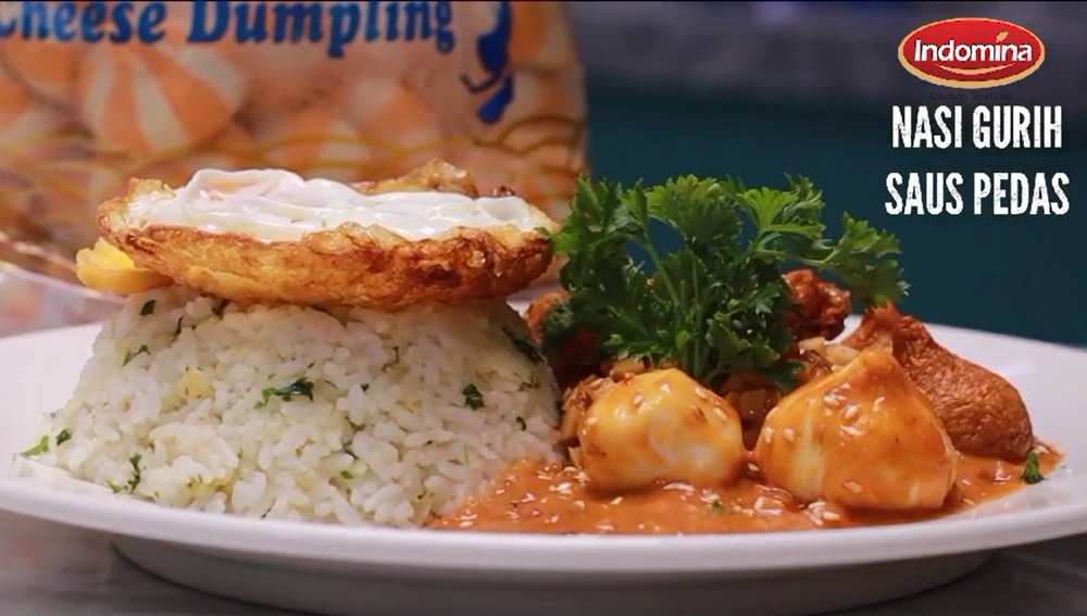Sajian Nasi Gurih Saus Pedas Indomina hadir dengan perpaduan cita rasa yang kaya dan menggugah selera. Nasi gurih hangat disiram saus pedas spesial lalu dipadukan dengan aneka olahan pilihan Indomina seperti Cumi Flower dengan tekstur kenyal dan bentuk cantik yang unik, Cheese Dumpling berisi lelehan keju creamy yang lumer di setiap gigitan, serta Fish Ball yang gurih dan lembut dengan rasa ikan pilihan yang autentik. Perpaduan semuanya menciptakan harmoni rasa gurih, pedas, dan creamy yang nikmat dalam satu piring, praktis untuk diolah namun tetap istimewa untuk dinikmati kapan saja.